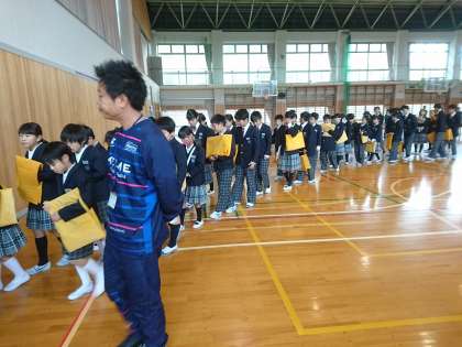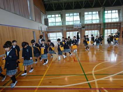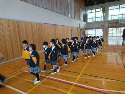 朝礼が終了し、子どもたちは列になって静かに教室に向かいました。