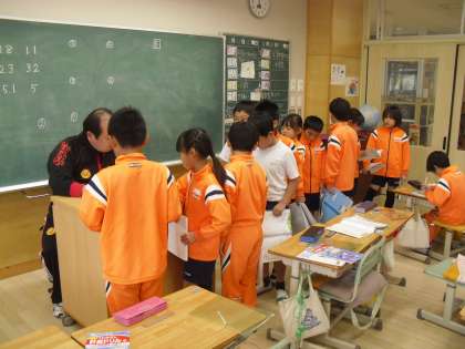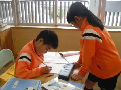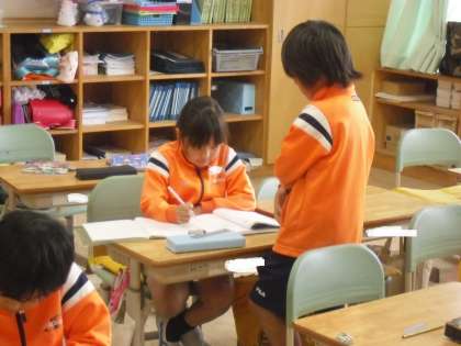 小数の問題を解いています。できた人が「ミニ先生」になり、教えてくれています。