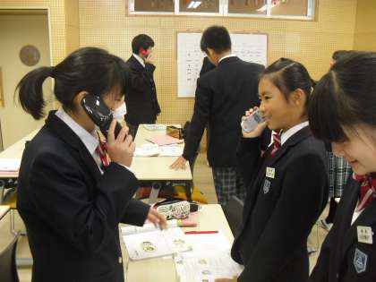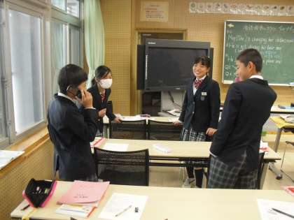 「音読発表に向けて、グループで会話になるように練習しよう。」を学習問題に、グループごと受話器を使ったりしながらスキットを組み立てています。