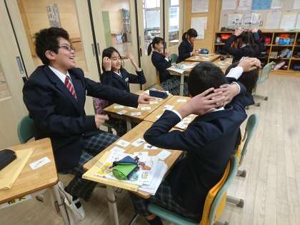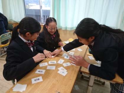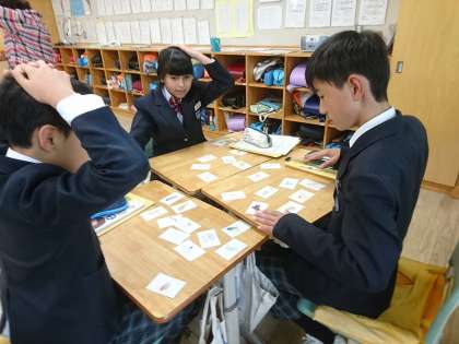 6年生は言語科「英語の時間」において、「My best memory」という教材を学習しています。英語に耳慣れするためにカルタゲームを行いました。