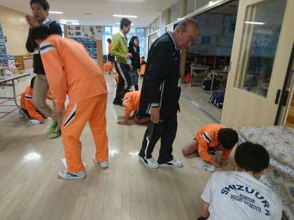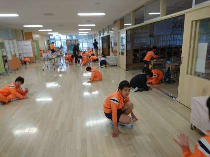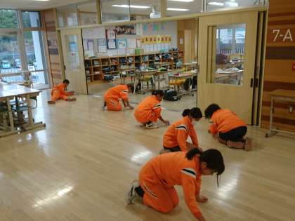 みんなでフロアの汚れ取りを黙々と行っていました。立志部教員も子どもたちと一緒に参加しています。
