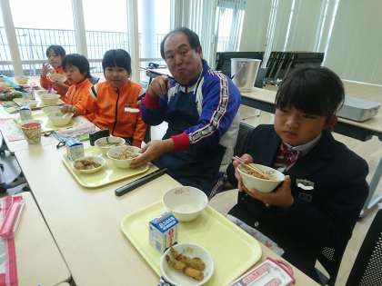 交流給食では学級担任も異学年の交流を楽しんでいました。