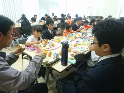月曜日から始まった異学年との交流給食ですが、本日は1年生と6年B組が給食を一緒にいただきました。