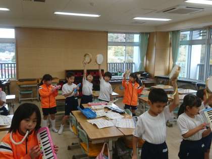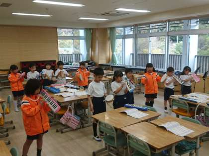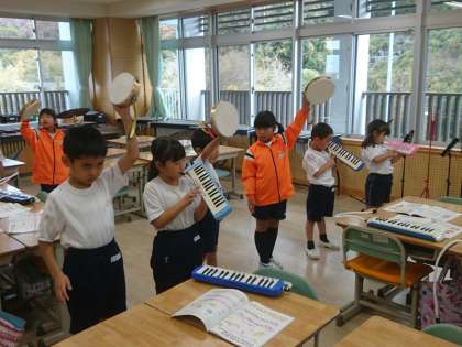 1年生は音楽で「子犬のマーチ」の合奏を行いました。鍵盤ハーモニカとタンブリンを使って、上手に演奏していました。