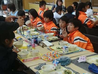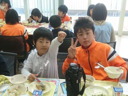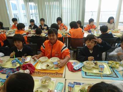 交流給食では、お兄さん・お姉さんが学校の弟・妹たちと楽しく会食しました。