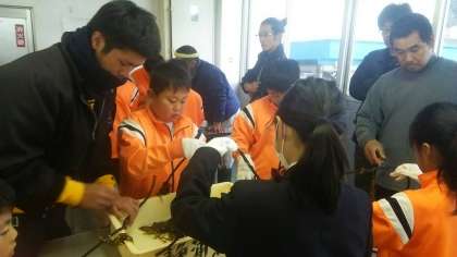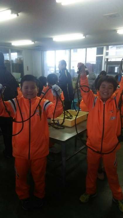 5年生は総合的な学習の時間において、静浦漁港青壮年部の協力でワカメの植え付けを行いました。