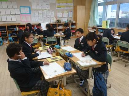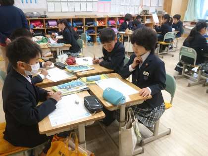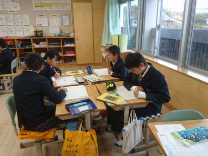 5年生は国語で「人の生き方を読もう レイチェル=カーソン」について学習しています。グループごと、分かったことを紹介しあっていました。