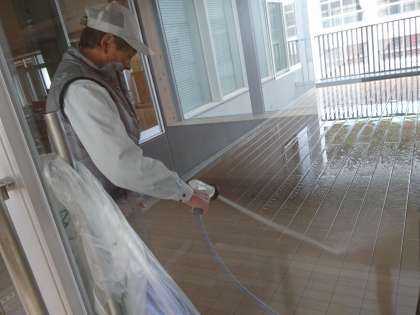 用務員が3階デッキを水洗浄清掃しました。