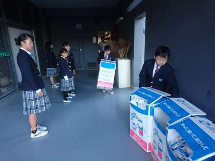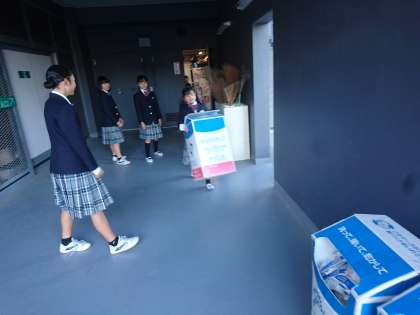環境委員の児童生徒がリサイクル活動の一環として牛乳パック回収を行っています。本日製紙会社の方が収集に見えるので、児童生徒が2階から1階へ牛乳パック回収ボックスを下ろしました。