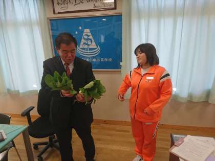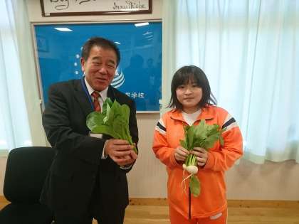 中CD組は作業学習の時間に、学校園で小松菜とかぶを作っています。この度、それらを収穫しかぶを校長先生に届けました。中CD組の皆さん、ありがとうございました。