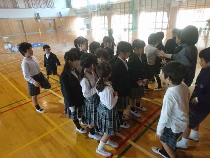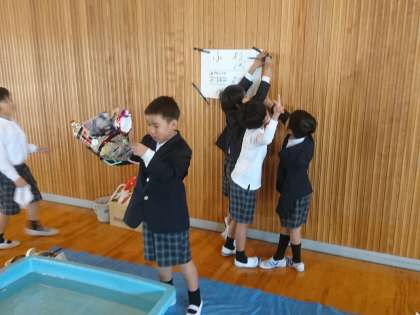 2年生は、体育館において生活科「あそびランド」の準備をしていました。この後、1年生を招待して、盛大に「あそびランド」を開催します。