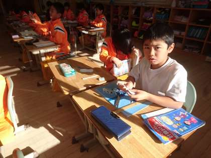 3年生は算数で「三角形」について学習しています。最初にはさみを使って長方形を作りました。その後、斜めに切り込みを入れると二等辺三角形になります。子どもたちは、二等辺三角形や正三角形の作り方を考えました。
