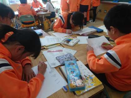 4年生は国語で、総合的な学習の時間で学習している「身の回りの危険を調べよう」とタイアップした教科横断型の授業を行っていました。子どもたちはグループごとの発表に向け、原稿の確認やスピーチ練習を意欲的に行いました。