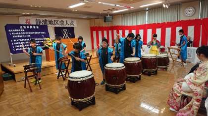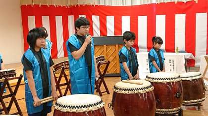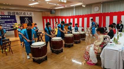 第二部のアトラクションでは、最初に文化芸術部「黒潮太鼓」が勇壮な演奏で成人を祝賀しました。