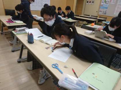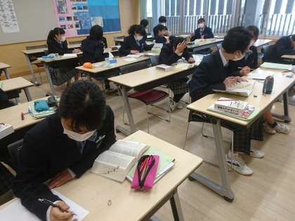 9年生は英語で「静浦小中を紹介しよう」という単元を学習しています。学校行事や部活動について英語で紹介文を書いています。