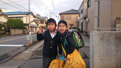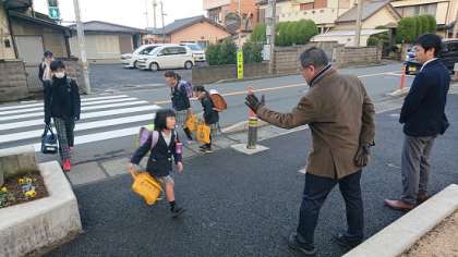 子どもたちの登校の様子です。正門で出迎える教職員と大きな声であいさつを交わしました。