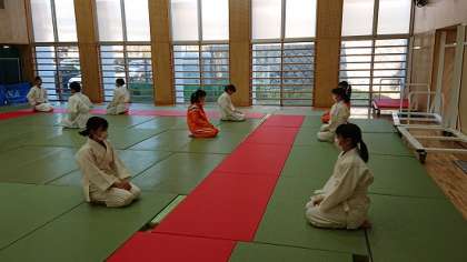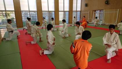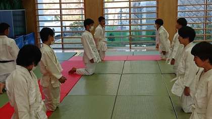 9年生は体育で柔道を行っています。今日は、柔道の礼儀作法(立礼と座礼)について学びました。