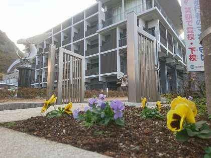 正門のビオラとパンジーが、子どもたちを迎えます。