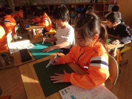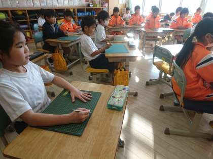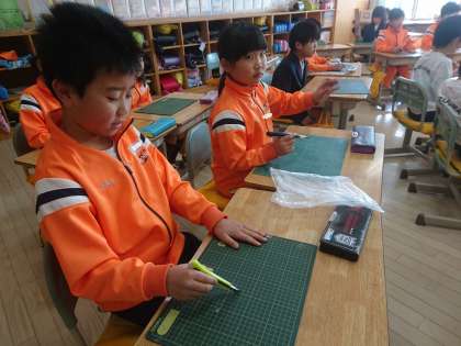 2年生図工で「カッターナイフの使い方」について学習しました。カッターナイフの持ち方や切り方など、みんなで確認しました。