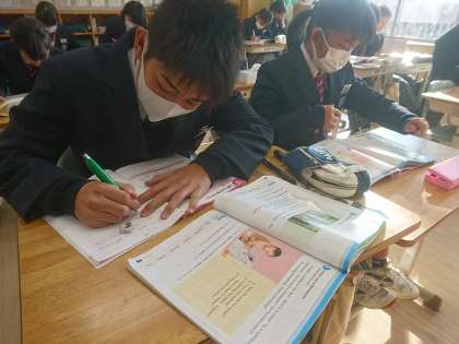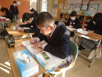 7年生は英語で本文を読み取り、新出語句などをワークノートに書いていました。