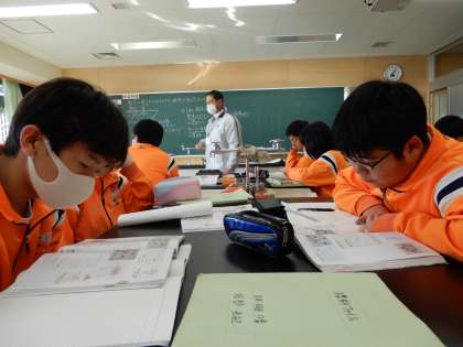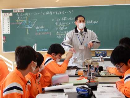 電気の周りには、どんな磁界になっているか。考えています。久しぶりの理科の授業で頑張っています。