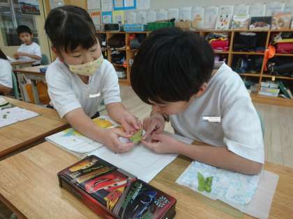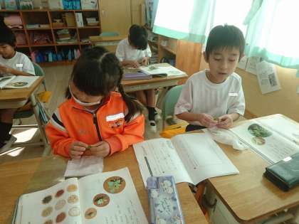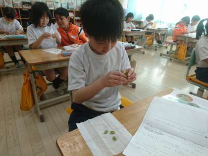 子どもたちは、学級担任が用意したサヤエンドウを見ながら理解を深めています。