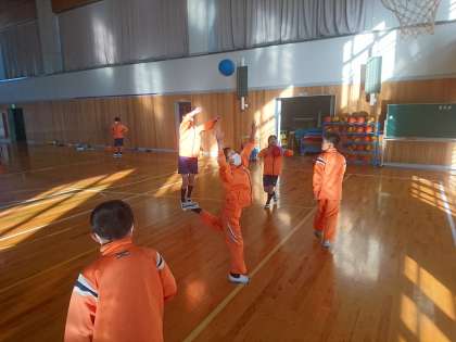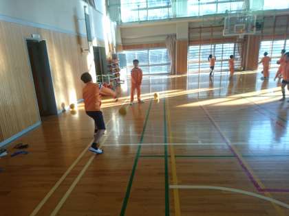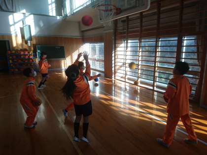 5年生は体育でバスケットボールを行っています。チームごとにシュートやパス回しなどの基本プレーを練習しました。