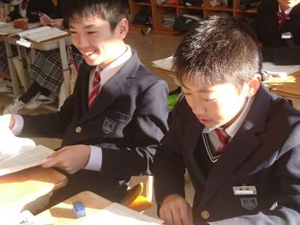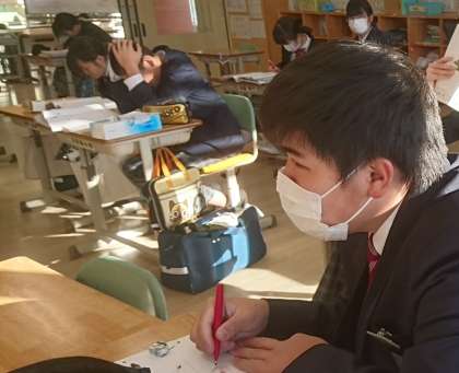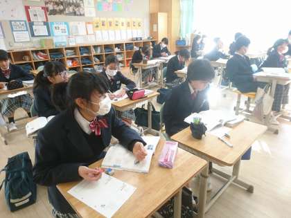 7年生は数学で「平面図形」について学習しています。今日は、平面と平面のつくる角度について話し合いました。