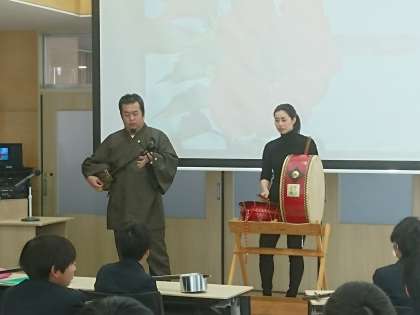 本日の第5時に8年生は三線教室を行いました。この教室には、久米島観光大使の小川悟さんとアシスタントの武藤さんをゲストティーチャーにお招きし、小川さんの講話と三線指導がありました。