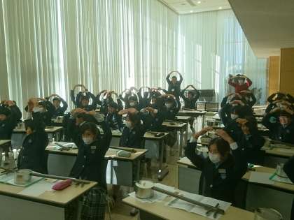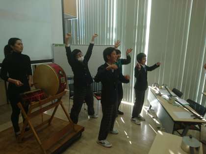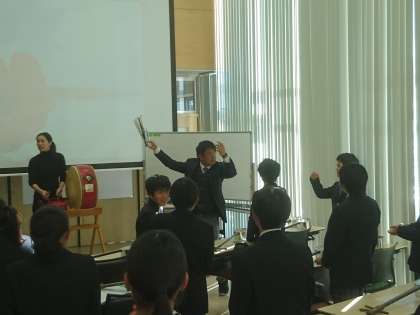 三線教室の最後には、沖縄の琉球民謡ユイユイを歌って踊りました。8年生や土屋先生も楽しく踊っていました。