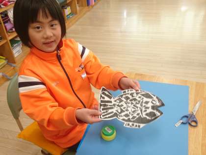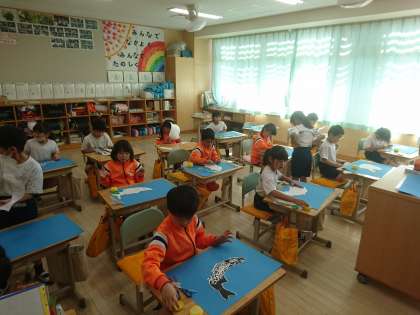 1年生は図工で「さかなのはんこ」制作を行っています。最初に先日作成したはんこの魚の周りをはさみで切り、色画用紙にのり付けする作業を行いました。