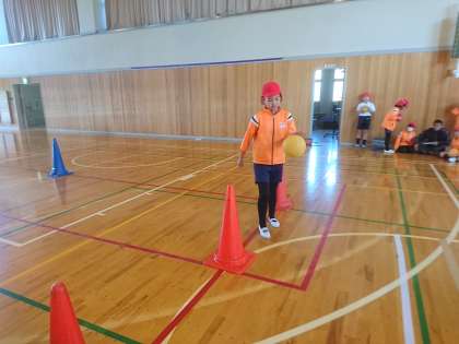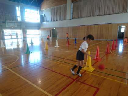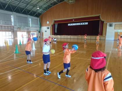 4年生は体育でバスケットボールを行っていました。シュート練習やドリブル練習をしていました。