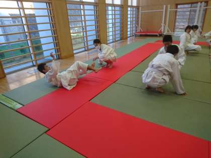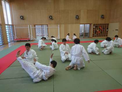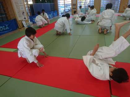 9年生は体育で柔道を行っています。最初にペアで受け身の取り方を練習しました。