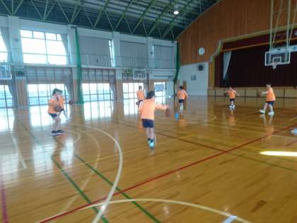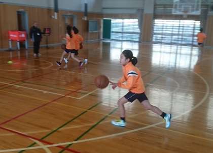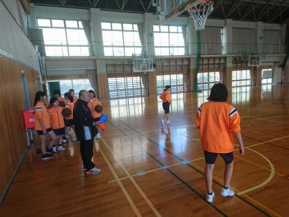 バスケットボール部の様子です。基礎基本の練習に励んでいます。土屋先生が活動を見守っています。