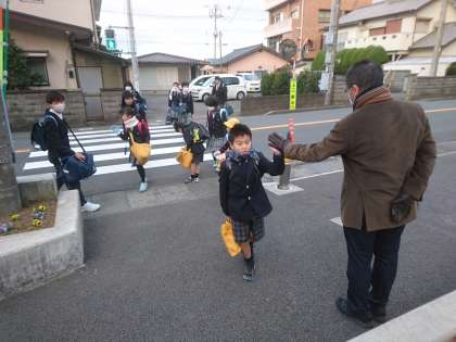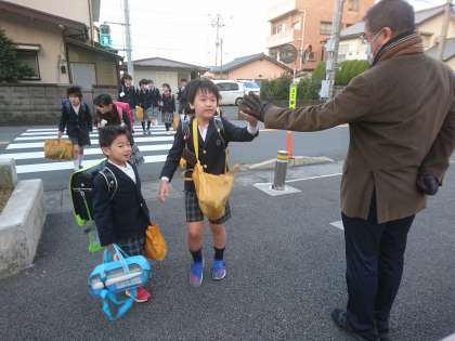 子どもたちが元気に登校してきました。正門では校長先生が子どもたち一人ひとりに声をかけています。