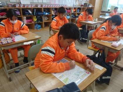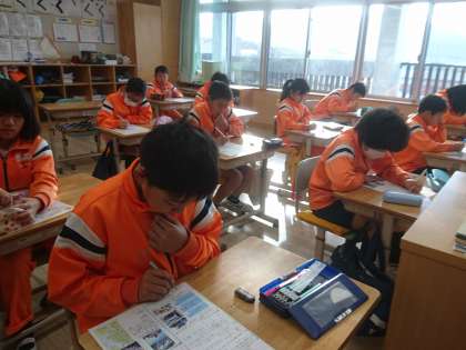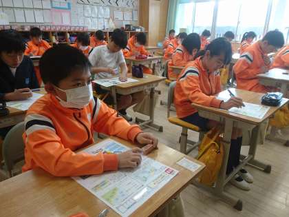 5年生は社会で「わたしたちの生活と工業生産」について学習しています。既習事項の確認として単元テストを行っていました。