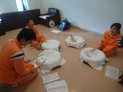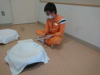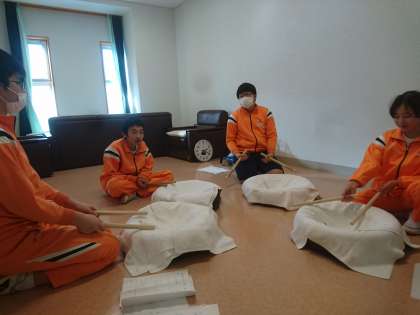 文化芸術部の様子です。三者面談中でしたので、音が出ないよう中古タイヤに布を巻いて、それをたたいていました。