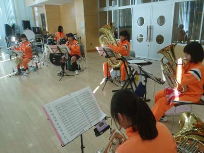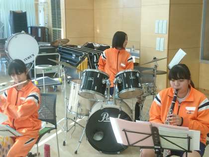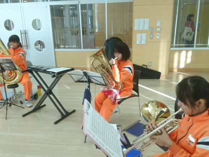 吹奏楽部は黒潮ホールで練習を行っていました。みんなで音合わせをしていました。