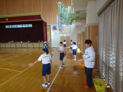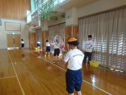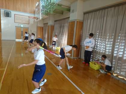 ソフトテニス部は体育館で活動をしていました。外部コーチの指導のもと、意欲的に打ち込みを行っていました。
