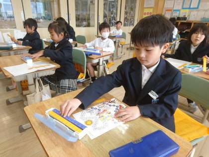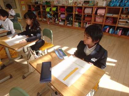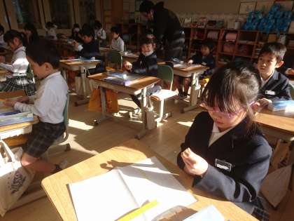 1年生は算数で「大きな数」を学習しています。十の位までの位取り板を使って、大きな数について確認しました。