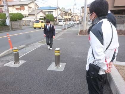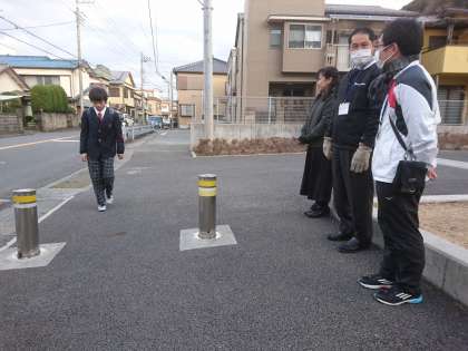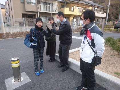 今朝の登校の様子です。正門前で教職員が児童生徒の登校の様子を見守っています。