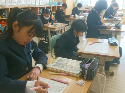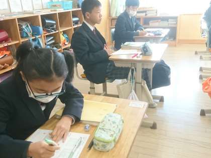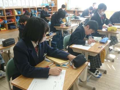 6年生の算数は、2クラスのソフトボール投げの結果を題材に、どちらの学級が優れているかを説明しあう授業を行っています。昨日行った学習の振り返りを行いました。