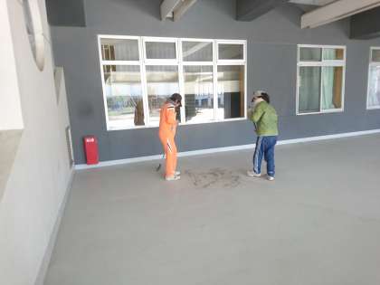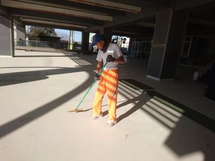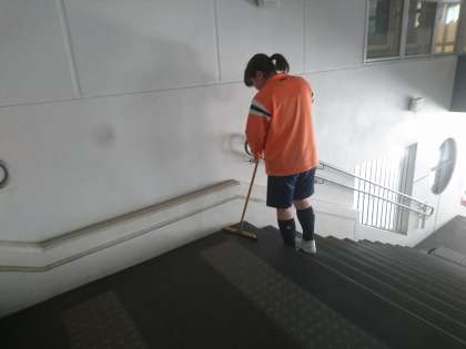 中C組の日常生活指導の様子です。朝トレーニングの後に1階ピロティ、階段の清掃を行いました。