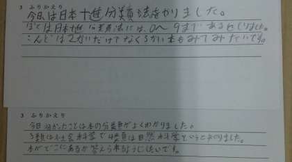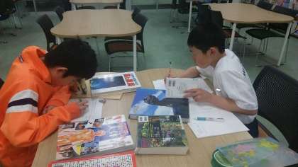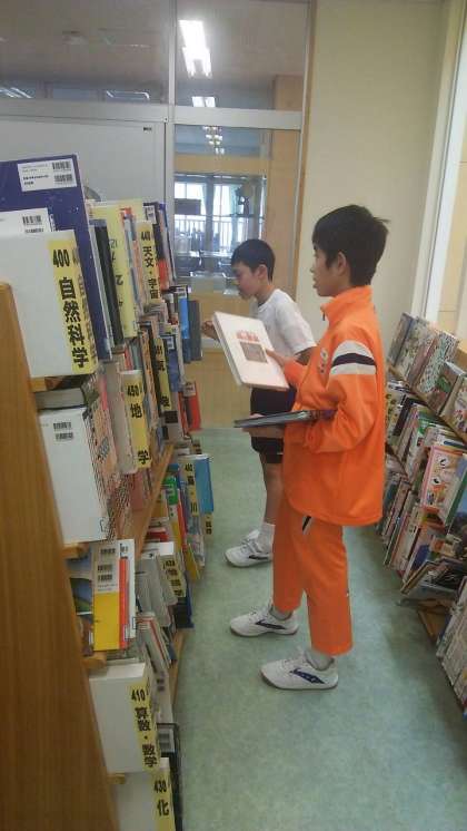 中CD組の合同の読解の授業です。図書館は、日本十進分類法で並べられていることを学んだあと、理科や社会で使う本を書棚から探して記録しました。