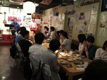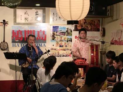沖縄の島唄が始まりました。ライブで沖縄文化に触れています。