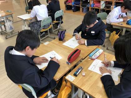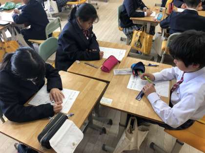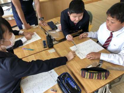 6Aの算数の授業では、“点対称”の課題で、図形に何本の対称軸があるか考えるグループ活動をしていました。