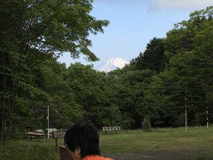 起床です。よく寝られたようです。意外に寒くなかったようです。森の合間から富士山も見えます。