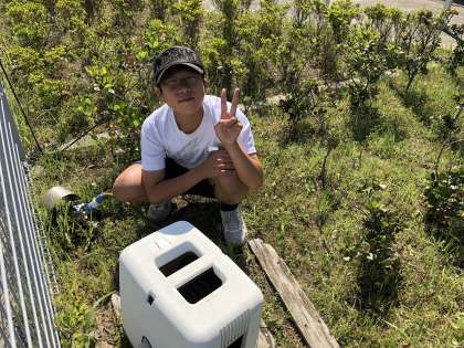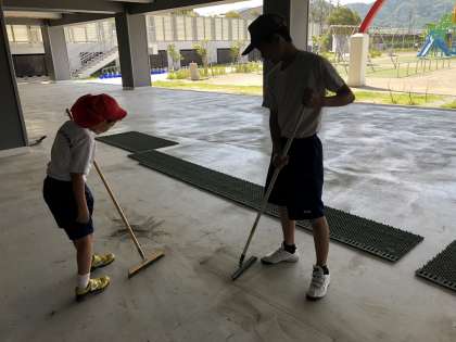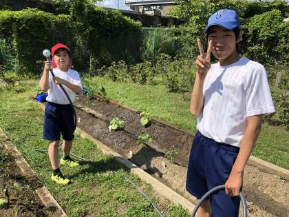 小中CD組の朝の様子です。2つの班に分かれて、畑の水やり、ピロティの清掃を行っています。