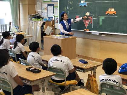 2つのグループに分かれて、教室では交通ルールや安全な運転の仕方を学び、事故に合わない、巻き込まれないためにどうしたらよいかを交通指導員さんと一緒に考えました。