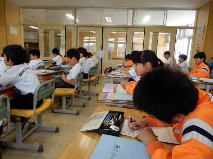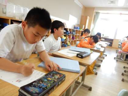 大志部長の先生が、4年生算数「大きい数のしくみ」の授業です。書き方、読み方を整理しながら学習しています。